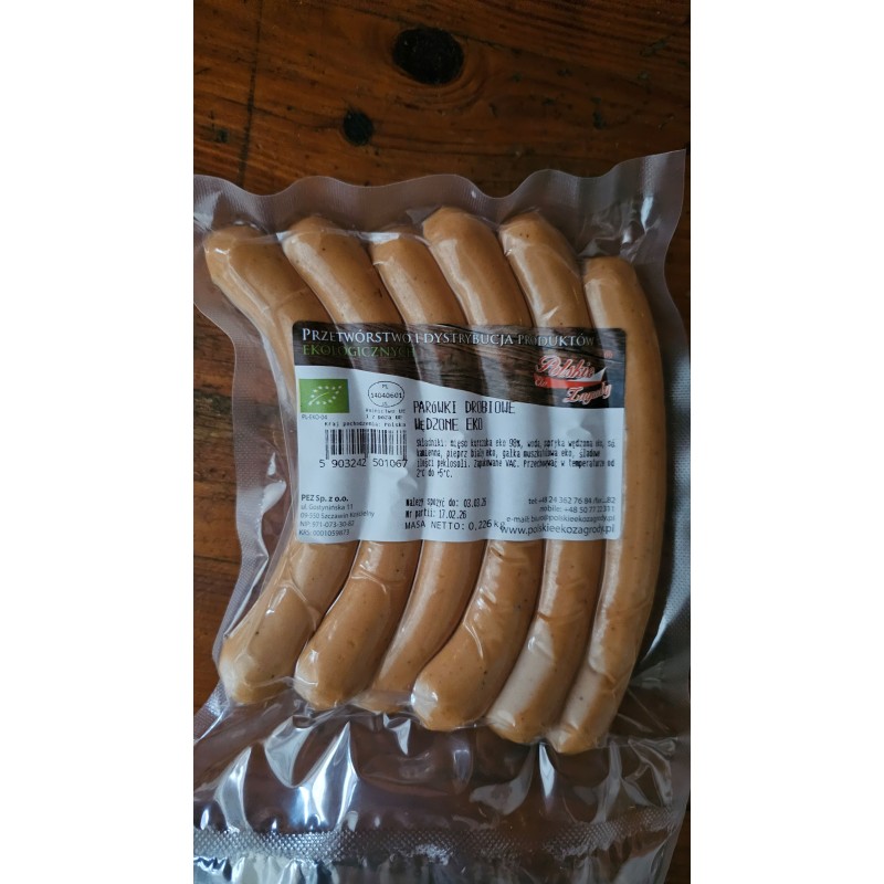 Skład: mięso kurczak eko 98%, woda, papryka wędzona eko, sól kamienna, pieprz biały eko, śladowe ilości peklosoli.