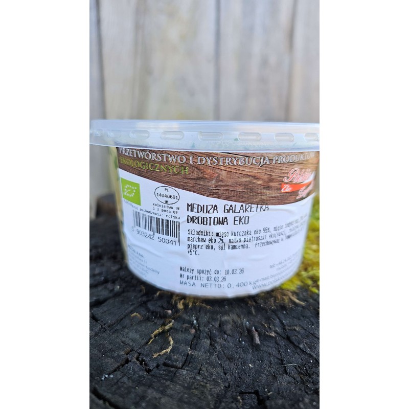 Skład: mięso z kurczaka eko, mięso z indyka eko, woda, marchew eko, natka eko, żelatyna, pieprz eko, sól kamienna.